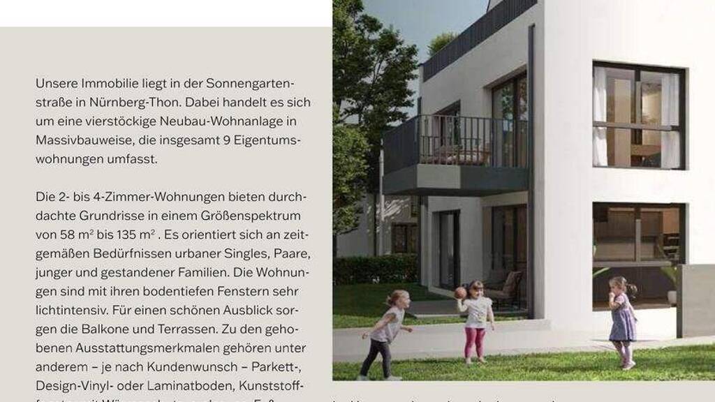 In naturnaher Umgebung entsteht "Am Schweigeracker 1, 90425 Nürnberg-Thon" eine moderne Wohnanlage mit 9 Wohneinheiten. Diese wert- und nachhaltig konzipierte Dachterrassenwohnung ist eine ideale Investitionsmöglichkeit für Kapitalanleger, Familien oder Paare, die einfach nur "großzügig wohnen" möchten. Sie punktet mit einem großzügigen Schnitt und bietet enorm viel Platz auf zwei Ebenen. Auf den beiden Dachterrassen genießen Sie neben einem Sonnenbad auch einen paradiesischen Blick über die Stadt..., eine Wohlfühloase in luftiger Höhe.