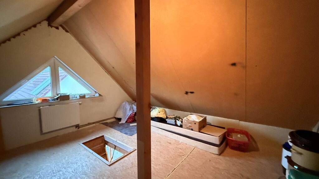 Im Dachgeschoss befinden sich ein großes (Eltern-)Schlafzimmer mit Ankleideraum sowie zwei Kinderzimmer (ca. 12 m² und ca. 9 m²). Wer Wert auf ein weiteres Badezimmer legt, kann in dem kleinen Zimmer bereits die notwendigen Anschlüsse finden. Ergänzend zu dieser Option lässt sich das große (Eltern-)Schlafzimmer wieder in zwei Räume aufteilen. Hierzu finden Sie in den Grundrissen einen entsprechenden Aufteilungsvorschlag. Eine Ausbaureserve zur Schaffung eines weiteren Zimmers findet sich im Dachboden/Studio. Ein ansprechendes Dreiecksfenster, ein Heizkörper und vorbereitete Elektrik sind dort bereits vorhanden.