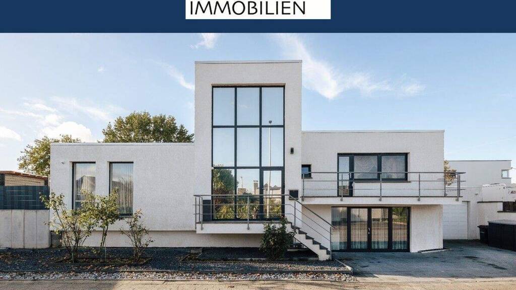 Ein freistehendes Einfamilienhaus, das schon beim ersten Blick beeindruckt: klare Linien, moderne Architektur und eine zeitlose Ästhetik, die sich mühelos von der Umgebung abhebt. Die Fassade wirkt wie ein Statement - reduziert, elegant und selbstbewusst. Besonders ins Auge fällt die beeindruckende, raumhohe Fensterfront im Eingangsbereich, die dem Gebäude eine außergewöhnliche Präsenz verleiht und gleichzeitig einen Ausblick auf das großzügige Entree offenbart. Der Zugang erfolgt über eine leicht erhöhte Ebene, was dem Haus zusätzlich eine gewisse Leichtigkeit gibt und die Architektur subtil betont.