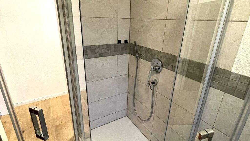 Die Wohnung verfügt über ein modernes Badezimmer mit Regendusche, Aufsatzwaschtisch, großformatigen Fliesen sowie einem Handtuchheizkörper.