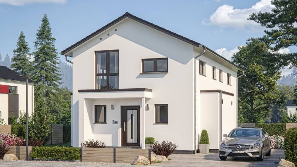 Fühlen Sie sich wohl! Dieses Haus bietet viel Raum fu?r kreative Wohnideen. Der Essbereich ist als Zentrum des Hauses angelegt, das großzu?gige Wohnzimmer bietet den Zugang zur Terrasse. Im Dachgeschoss sind Eltern- und Kinderbad durch eine Schiebetür getrennt, wobei auch die gleichzeitige Nutzung möglich ist. Clever gelöst: Der Komforterker in Kombination mit der Terrassenu?berdachung für mehr wetterunabhängigen Platz. Dieser Entwurf ist das optimale Wohnkonzept für kompakte Grundstücke.