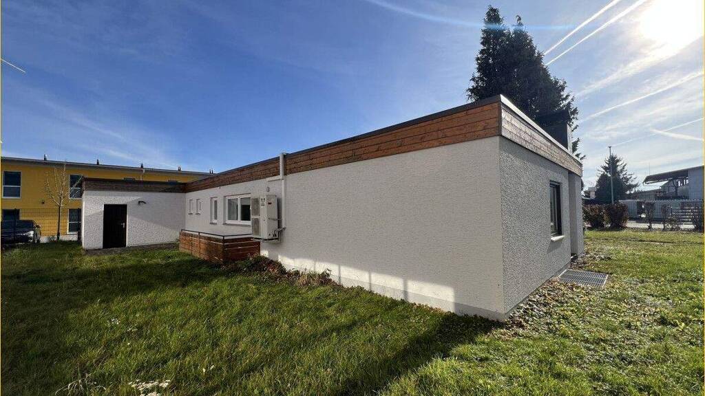 Der Außenbereich überzeugt durch eine moderne Fassadengestaltung in heller Putzoptik mit Holzakzenten. Der Zugang zum Gebäude erfolgt über einen Treppenaufgang. Eine außenliegende Lüftungsanlage unterstreicht den technisch zeitgemäßen Standard des Objekts. Insgesamt präsentiert sich das Gebäude in einem gepflegten Gesamtzustand und eignet sich ideal als Unternehmensstandort für Dienstleister, Agenturen, Kanzleien oder vergleichbare gewerbliche Nutzungen.