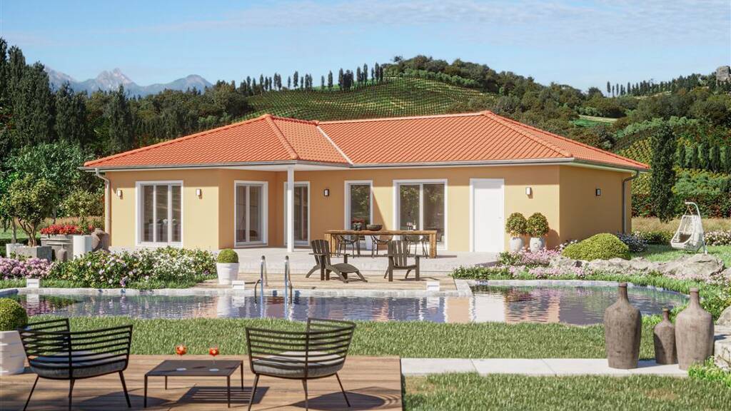 Sie möchten gern in einem wunderschönen Bungalow wohnen, Ihr Grundstück ist aber sehr klein bemessen in der Breite oder Tiefe? Dann ist der Bungalow 117 B genau der richtige Bungalow für Sie! Über einen überdachten Hauseingang gelangt man in die Diele, welche in die offene Küche mit angeschlossenem Hauswirtschaftsraum übergeht. Der Wohn- und Essbereich kann mit zwei Fensterelementen geplant werden - mit doppelflügeliger Terrassentür oder mit einem großen Panoramafenster inklusive Terrassentür - ein schöner Blick in den Garten ist so oder so garantiert. Über den weiteren Flur gelangen Sie zum Schlafzimmer, dem weiteren Zimmer und zum Gäste-WC und Voll-Bad. Mit einem schicken Walmdach oder einem Satteldach wird dieses Haus zu Ihrem einzigartigen Wohntraum.