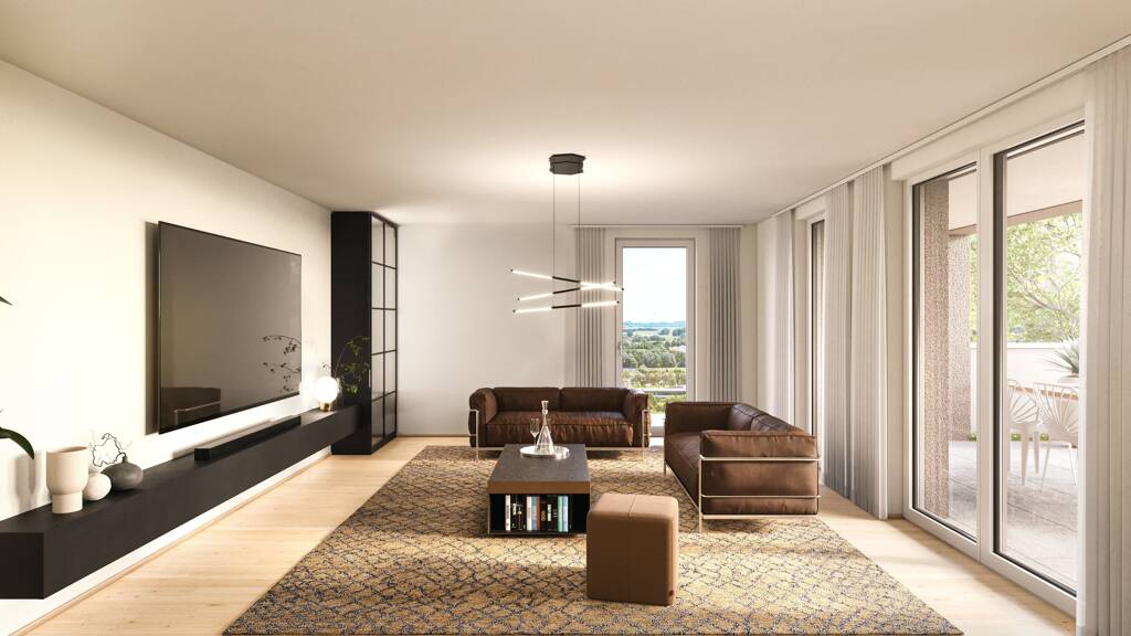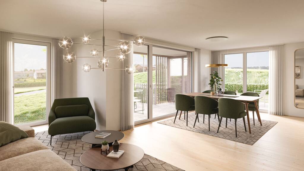 Die offenen Wohnbereiche in den Wohnungen bestechen durch die sehr helle und freundliche Raumgestaltung. Durch die bodentiefen Fenster wird der komplette Wohn- und Essbereich mit ausreichend Tageslicht versorgt und es entsteht eine freundliche Atmosphäre.
