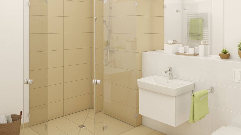 Das AVANTUM®-Designbad verfügt über einen Handtuchwärmekörper, bodengleicher gefliester Dusche mit Duschkabine aus Echtglas, großflächigem Wandspiegel, modernen Sanitärobjekten uvm.