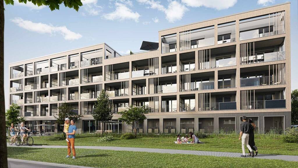Die fünf Neubauten entstehen in einer nachhaltigen Holzhybrid-Bauweise und mit attraktiver Fassade – teils begrünt. Hier warten 91 Wohnungen mit 2 bis 4 Zimmern, Balkon, Terrasse oder Loggia auf Sie. Einige sogar mit Garten oder Terrassengarten. Aufzug und elektrische Rollläden sorgen für Komfort.
