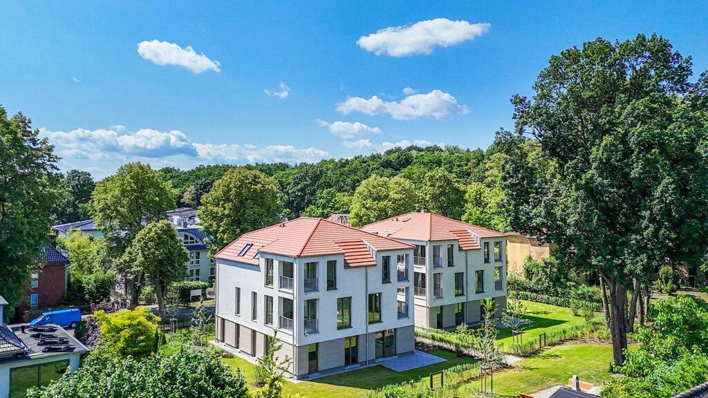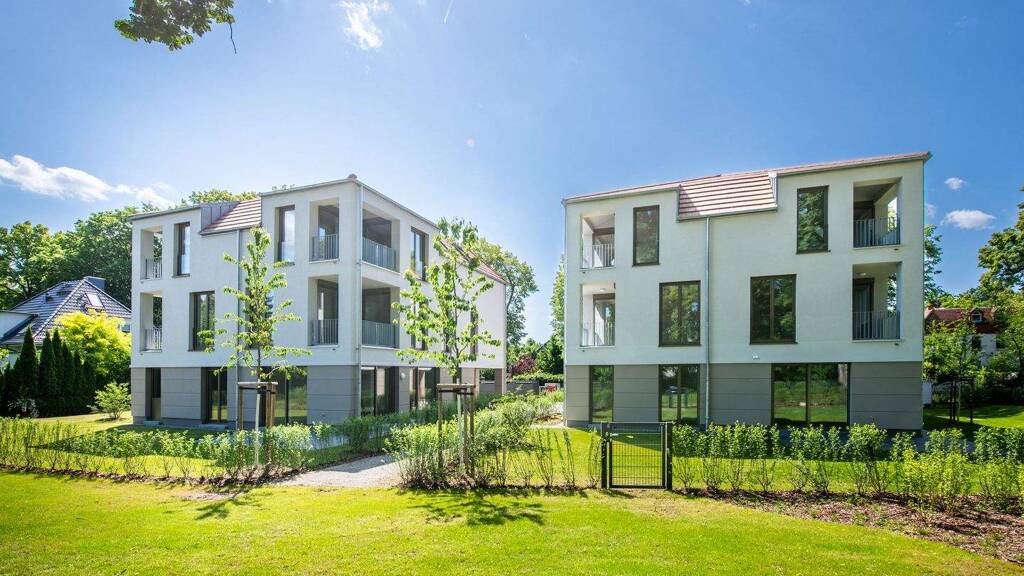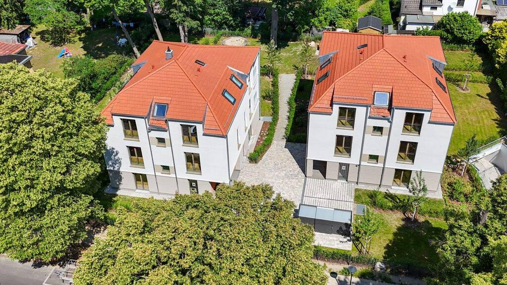 Ein ausdrucksstarkes Duo bilden die beiden Mehrfamilienvillen mit insgesamt 10 Wohnungen, Aufzug und Tiefgarage. Die Gebäude erheben sich auf einem großzügigen, parkähnlichen Gartengrundstück. Ein abgesetztes Erdgeschoss, die beiden Obergeschosse und die außergewöhnliche Dachform übersetzen eine klassische Architektur in einem modernen Kontext. Dazu gehören effizient konzipierte Wohnungen mit hohem Wohnkomfort. Im Erdgeschoss nehmen jeweils die 4-Zimmer-Wohnungen die gesamte Etage ein und besitzen einen großen Privatgarten. Auf den beiden darüber liegenden Etagen befinden sich auf jeder Ebene zwei 2-Zimmer-Wohnungen. Großzügige Fensterflächen ermöglichen einen optimalen Lichteinfall in jede einzelne Wohnung und schöne Sichtachsen. Attraktive Terrassen, Loggien und wunderschöne Gartenanteile ermöglichen das Wohnen in einer idyllischen Atmosphäre. Der gemeinsame Hof und der Spielbereich laden zum Verweilen und plaudern mit den Nachbarn ein.
