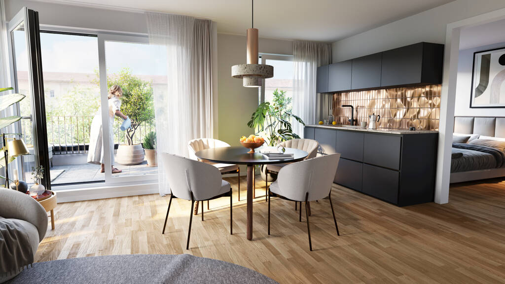 Das Wohnensemble besteht aus zwei unabhängigen Wohngebäuden, die doch viele Gemeinsamkeiten aufweisen: Von außen zeichnen sie sich durch eine moderne, gradlinige Architektur, begrünte Flachdächer sowie bodentiefe Fenster aus. Von innen überzeugen beide gleichermaßen mit hochwertigen Ausstattungsmerkmalen und cleveren Grundrissen. Verbunden über einen begrünten Innenhof mit Kinderspielmöglichkeit und Raum zur Erholung.