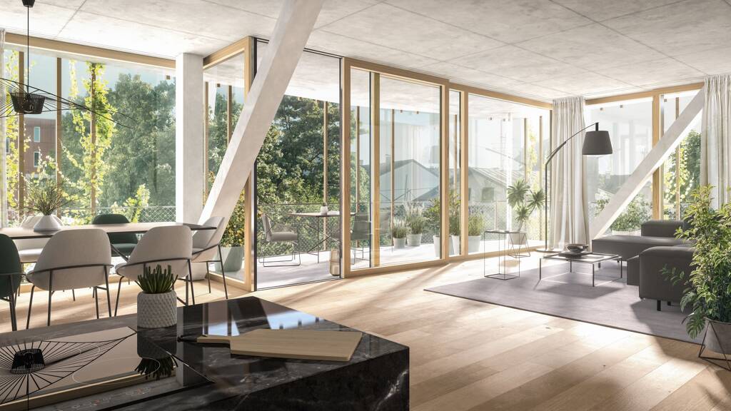 Eine natürliche Erweiterung des Lebensraumes: Alle Wohnungen sind nicht nur hell und leicht gestaltet, sondern lassen anhand großflächiger Glas und Schiebetüren innen und außen ineinanderfließen. Von den Holzdielen bis hinaus auf die Terrasse, die luftige Ausblicke und Auszeiten schenkt und dabei dennoch durch die filigrane Stabwolke und das Grün der Pflanztröge geschützt ist.