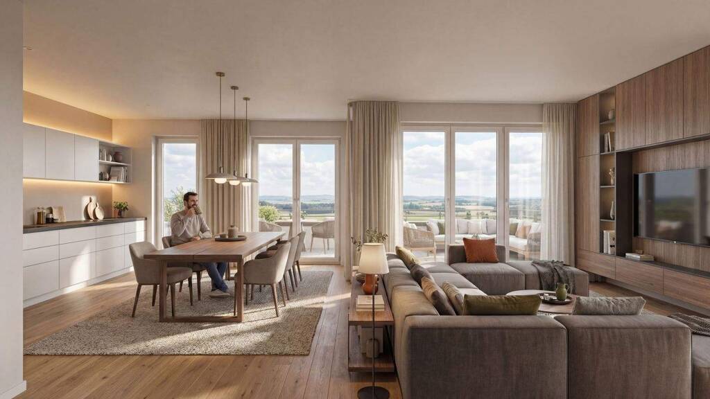 Die geplanten Wohnungen umfassen 2- bis 3-Zimmer-Einheiten mit Wohnflächen von etwa 63 m² bis rund 76 m². Großzügige Fensterflächen, offene Wohn- und Essbereiche sowie eine moderne und hochwertige Bauausführung sorgen für ein helles und komfortables Wohngefühl. Die klar strukturierten Grundrisse bieten viel Raum für individuelle Einrichtungsideen und eine optimale Nutzung der Wohnflächen.