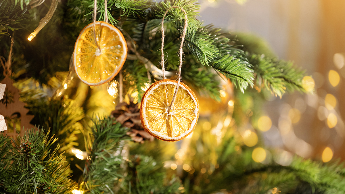 - Schneide Orangen in dünne Scheiben, trockne sie im Ofen bei niedriger Temperatur und fädle sie auf Schnüre.