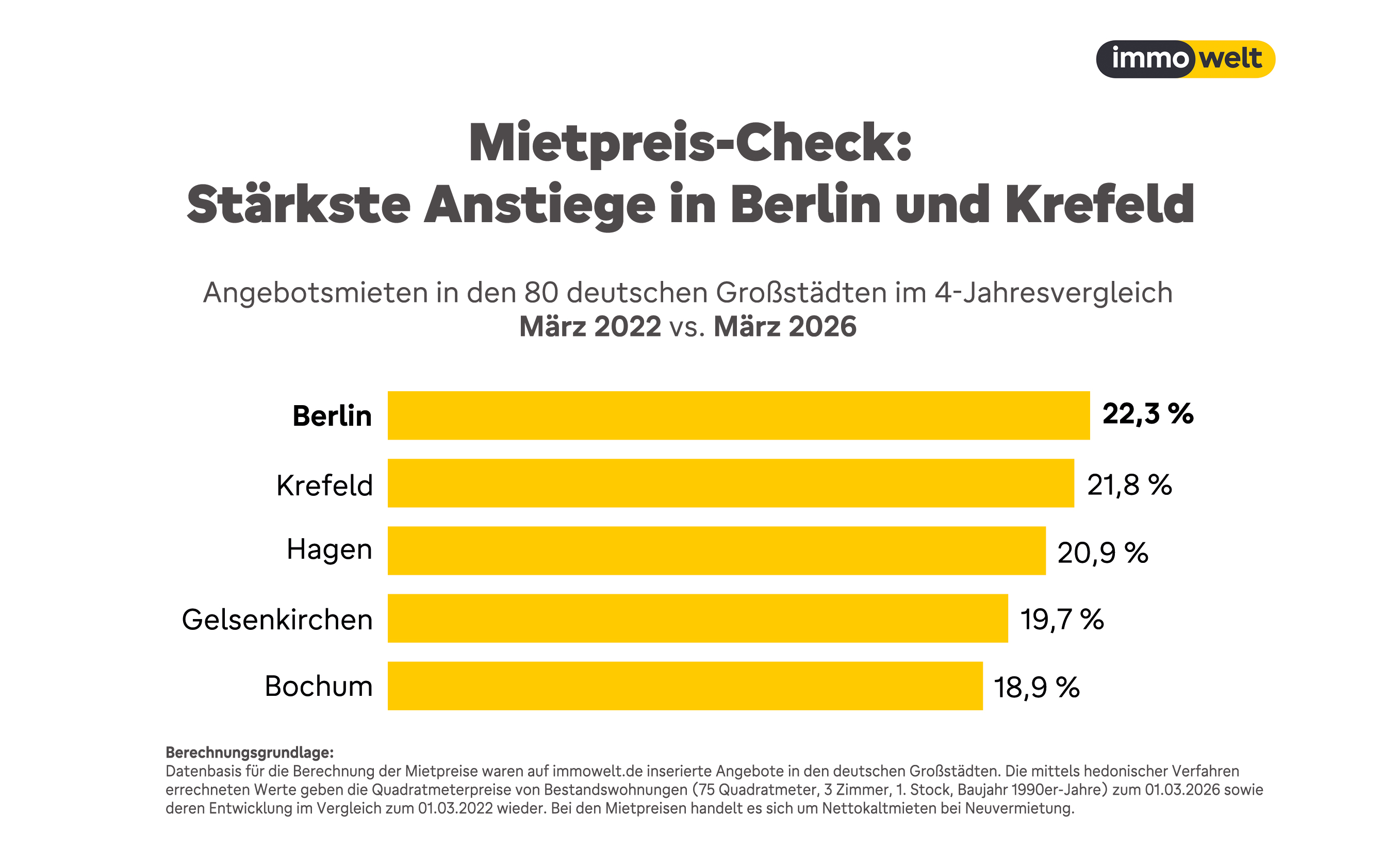 Allein unter den größten Mietanstiegen liegen 24 Großstädte über dem Inflationsniveau. Dazu zählen neben Berlin (+22,3 Prozent) auch Städte wie Krefeld (+21,8 Prozent), Hagen (+20,9 Prozent) oder Gelsenkirchen (+19,7 Prozent).