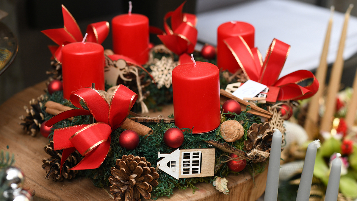 - Selbstgemachte Adventskränze: Binde frische Tannenzweige zu einem Kranz und dekoriere ihn mit roten Schleifen und kleinen silbernen Kugeln.