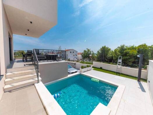 Zum Verkauf steht ein wunderschönes modernes Haus mit privatem Pool und Panoramablick auf das Meer, in idealer Lage in Vodice, nur wenige Gehminuten vom Strand und dem Stadtzentrum entfernt. Dieses a...
