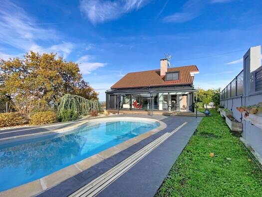Exceptional location just ten minutes from Geneva, near Vesenaz, a welcoming family sized furnished house of 240 m2 with superb views of Lake Geneva and the Jura. Beautiful volume for a living room o...