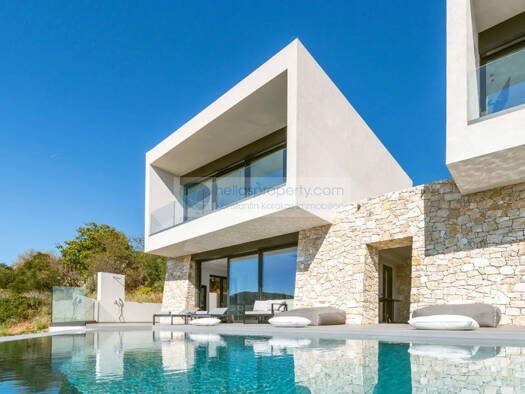 Eine neuwertige und architektonisch sehenswerte Natursteinhaus-Villa thront auf einer Anhöhe mit überwältigenden Blick auf die Küste, das Meer und das gegenüberliegende Festland. Das begrünte Grundst...