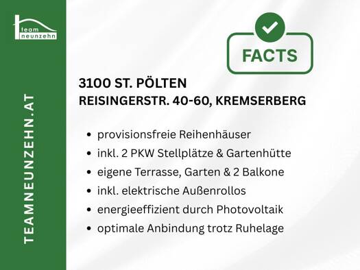 Erfüllen Sie sich den Traum vom Eigenheim in sehr guter Lage am Kremserberg in St. Pölten! Projektdetails: Hier entstehen 11 freifinanzierte Reihenhäuser im Eigentum, die modernste Wohnqualität...