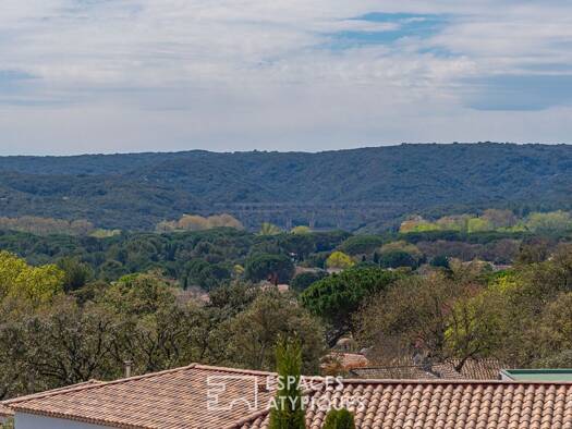 Just 15 minutes from Uzes, perched above a sought-after village where tranquility meets breathtaking scenery, this contemporary 170 m2 (1,830 sq ft) bastide overlooks the Pont du Gard and its majesti...