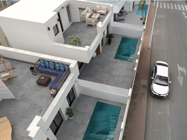 NEUBAU – Halb-freistehende Villen mit privatem Pool in San Pedro del Pinatar Dieser exklusive Neubau umfasst insgesamt 8 moderne Einfamilienhäuser und Doppelhaushälften, alle mit privatem Pool, Terra...