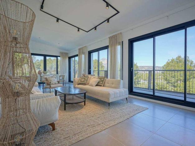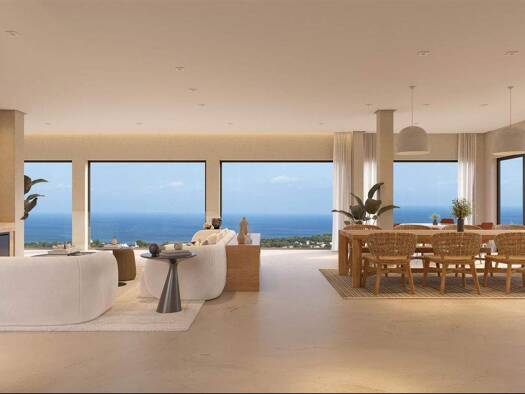 Elegante Architektur, inspiriert von Ibiza und dem Mittelmeer Die Villa besticht durch ihre weiße Fassade, abgerundete Ecken und handgeschnitzte Akzente aus Montgó-Stein, die Wärme und Authentizität ...