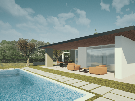 Objektbeschreibung Neubauvilla in ruhiger Lage mit einem 840m² großen Grundstück und Privat-Pool. Raumaufteilung Die Innenaufteilung umfasst ein großes Wohnzimmer mit Küchenzeile, das durch ein große...