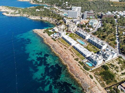 High-Luxus-Apartment mit Panoramablick auf das Meer, Swimmingpool und Fitnessraum Apartments direkt am Meer in der Stadt Santa Eulalia del Río auf Ibiza. Das Anwesen verfügt über 32 geräumige Apartme...