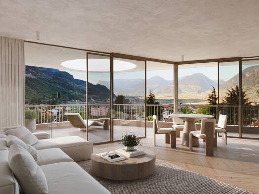 Ein Zuhause, das Großzügigkeit und Ästhetik perfekt vereint: Die weitläufige Terrasse eröffnet beeindruckende Ausblicke über die Dächer von Schenna bis zu den Bergen des Meraner Landes. Der offene Wo...