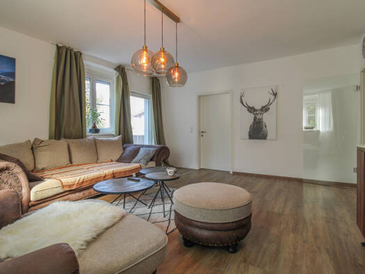 Diese mondäne, in modernem Outfit gestaltete Wohnung ist in einem zeitgenössichen Haus - Baujahr 2012/ Modernisierung im Jahr 2023 - mit nur zwei Einheiten angeordnet. Eine großzügige & offene Raumgestaltung mit Blick auf die umliegende Natur/ Bergkulisse samt hochwertiger & energieeffizienter Bauausführung & Ausstattung sprechen für sich - Fußbodenheizung/ Luft-Wärme-Pumpe, beeindruckende Raumhöhe mit Holz-Sichtdachstuhl, Böden in Echtholz-Parkett, elektrisch betriebene Rollos an allen Fenster...