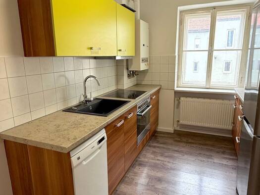 Ein besonderes Wohngefühl verbreitet dieses helle, sofort verfügbare Mietobjekt mit Balkon in familienfreundlicher Umgebung nahe des Hauptplatzes. Eingeteilt in: * Vorraum * Küche (noch zu möblieren) und anschließendem Zimmer mit Ausgang auf den kleinen Frühstücksbalkon * 1 großes Schlafzimmer * 2 weitere Zimmer - wurden mittels Riegelwand abgetrennt - ursprünglich ein weiteres großes Schlafzimmer  * Bad mit Badewanne, Anschluss für die Waschmaschine und Toilette Stilec...