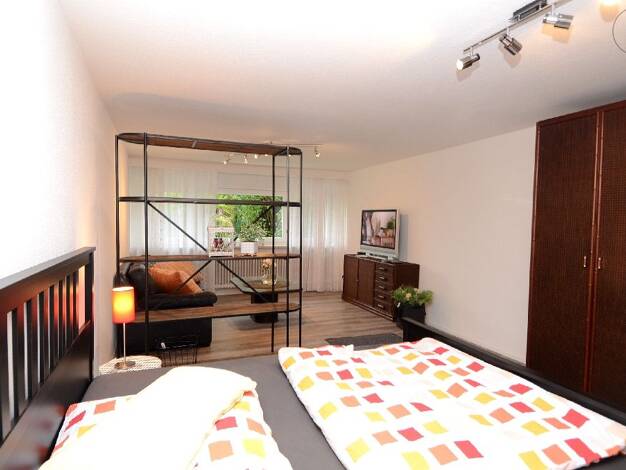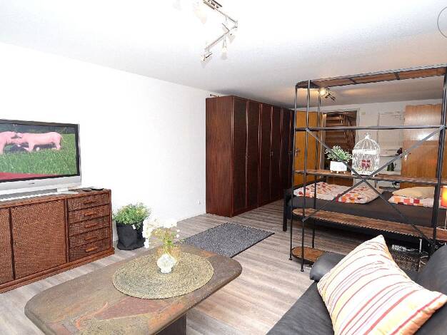 Die schöne, ruhige 1,5 Zimmer Wohnung liegt im Souterrain eines 2-Familienhauses in Bad Säckingen. Die Wohnung verfügt über einen Wohn-/Schlafbereich, eine Küche mit Esszimmer und ein Badezimmer. Der geräumige Schlafbereich hat ein modernes Doppelbett (180/200) und einen großen Kleiderschrank. Ein Regal dient als Raumteiler zum Wohnbereich, der mit einem Ledersofa, einem Wohnzimmertisch und einer großen Kommode ausgestattet ist. Von hier aus hat man einen schönen Blick in den Garten. Vom Wohn/S...
