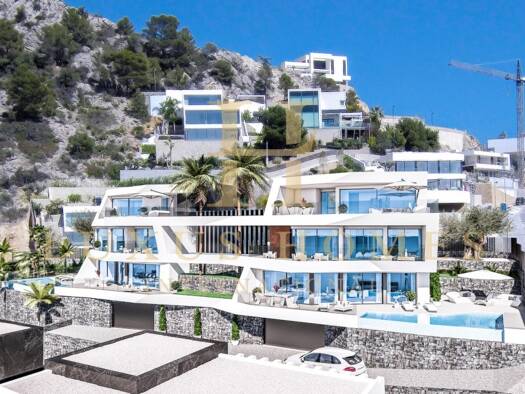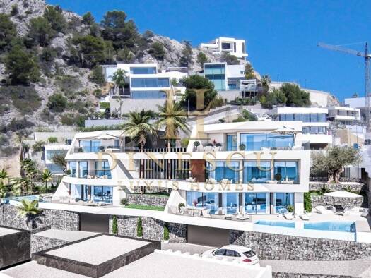 Hochwertige Luxus-Doppelhaushälfte mit privatem Außen- und Innenpool, großer Terrasse und einem fantastischen Panoramablick aufs Meer Eigenschaften des Anwesens: - 4 Schlafräume und 4 Bäder - Hochwer...