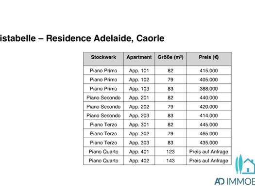 In zentraler Lage an der Spiaggia di Ponente in Caorle, nur 100 m vom Strand und wenige Schritte vom bekannten Viale Santa Margherita entfernt, entsteht das neue Residence Adelaide. Die moderne Wohna...
