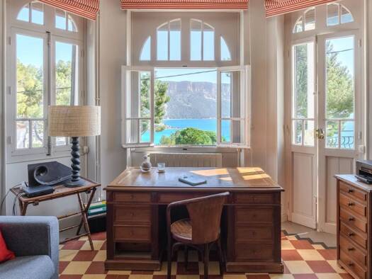 An exceptional 470 m2 architect-designed villa overlooking the bay of Cassis. Spread over two levels, it features a lush patio, a spacious sea-view reception with fireplace, a fully equipped independ...