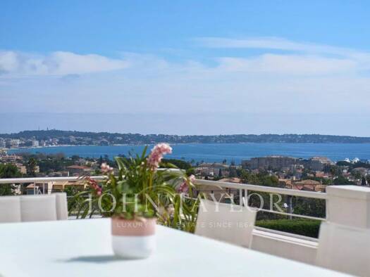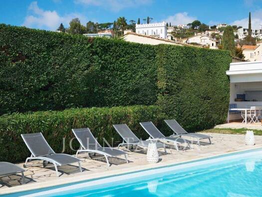 Sur la colline de Golfe Juan, cette belle villa entièrement rénovée offre une vue panoramique sur la mer et le Cap d'Antibes. Édifiée sur un terrain d'environ 1 478 m² avec piscine, elle se compose c...