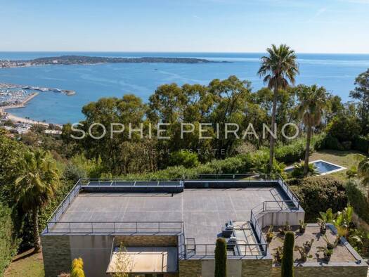 Auf den Anhöhen von Golfe-Juan, im Herzen eines Landschaftsgartens von ca. 3000 m² bietet diese wunderschöne Villa mit hochwertigen zeitgenössischen Leistungen einen außergewöhnlichen Panoramablick a...