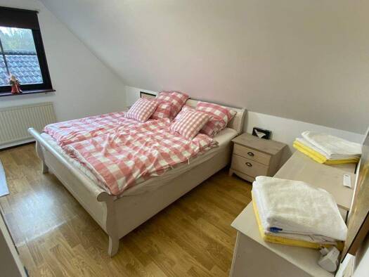 EG: Flur, Wohnzimmer, Esszimmer, Terrasse, Küche, Schlafzimmer, Duschbad, Hauswirtschaftsraum, Heizungsraum, Doppelgarage, zwei Abstellräume OG: großer Flur mit offenem Kamin, Bad mit Wanne, WC und B...