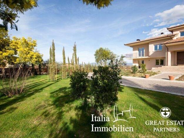 Castiglion Fiorentino, neu erbaute Einzelvilla in Panoramalage, mit Blick auf die toskanische Landschaft und die Burg von Montecchio. Das Anwesen hat einen großen Garten von ca. 1200 Quadratmetern, i...