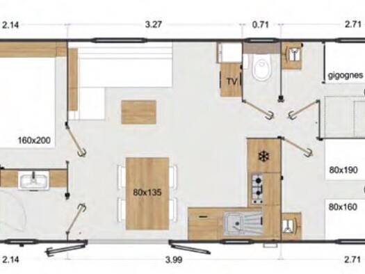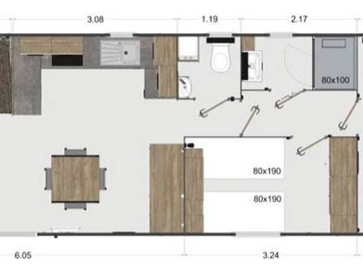 Das Chalet vom Baujahr 2021 ist ein 44 qm2 großes Modell mit Wohn/Essbereich, voll ausgestatteter Einbauküche, drei Schlafzimmer mit insg. 6 Schlafplätzen, einem Badezimmer mit Dusche und Toilette, 2...
