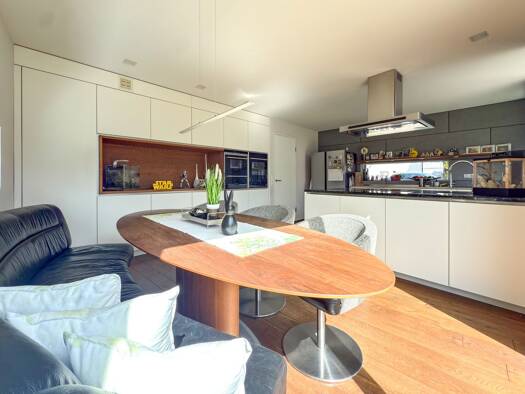 - 80 m² Wohnfläche | 20 m² Terrasse - moderne, hochwertige Ausstattung von regionalem Schreiner - Küche mit Bora-Induktionskochfeld und Backrohr mit Dampfgarfunktion - raumhohe Verglasung im Wohn-Ess...