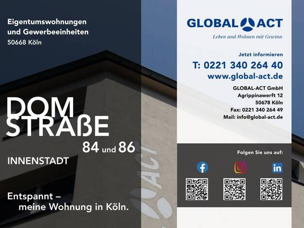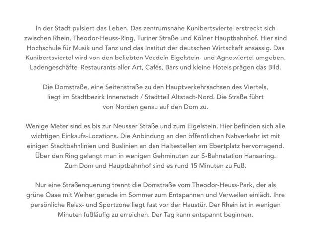 Eine Immobilie in der Kölner Innenstadtlage ist auf lange Sicht wertbeständig, was sie insbesondere auch zur Kapitalanlage attraktiv macht. Die beiden Bestandsimmobilien in der Domstraße 84 und 86 au...