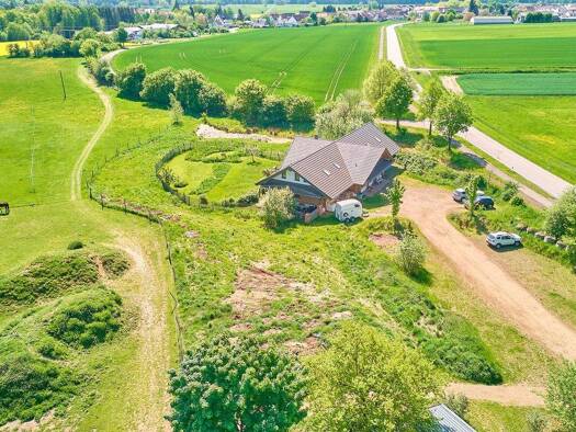 Diese besondere Pferdeimmobilie in Hütschenhausen vereint energieeffizientes Wohnen, moderne Pferdehaltung und großzügige Freiflächen auf rund 5,5 Hektar im Eigentum. Das 2015 errichtete Blockhaus bi...