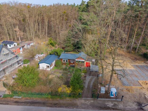 Angeboten wird ein wunderschönes Waldgrundstück bebaut mit einem Bungalow und einem Schuppen. Das 1180 qm große Grundstück mit rechteckigem Zuschnitt, könnte sehr gut mit einem zweistöckigen Eigenhei...