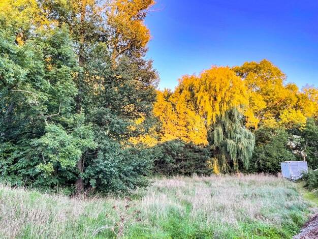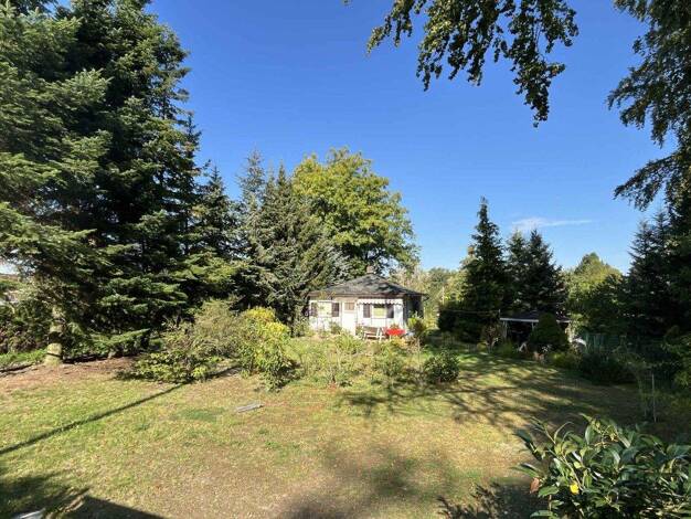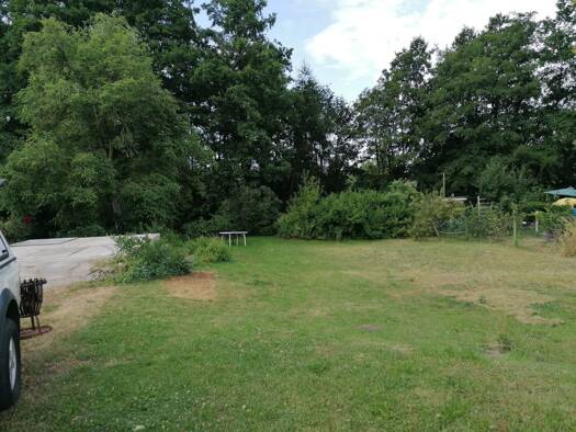 Das Grundstück liegt nahezu eben. Die östliche Hälfte ist mit einigen Nadelbäumen bewachsen. Hier steht auch ein hölzerner Schuppen. Die westliche Seite besteht überwiegend aus Wiese sowie kleineren ...