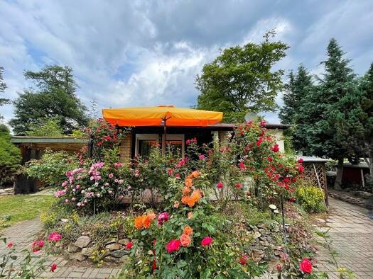 Das Grundstück liegt nahezu eben. Die Mitte wird von zwei großen Laubbäumen geprägt. Zur Straße hin stehen auch kleiner Gehölze. Im östlichen Teil steht der eingeschossige Bungalow. Dieser wird einer...