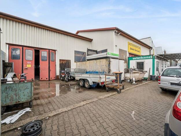 Das angebotene Grundstück umfasst zwei Flurnummern mit insgesamt ca. 3.172m² Fläche. Darauf wurden ca. 1988 eine Werkstatt und ca. 2002 eine Kalthalle errichtet. - Werkstatt (ca. 54,97m²) und Lagerha...