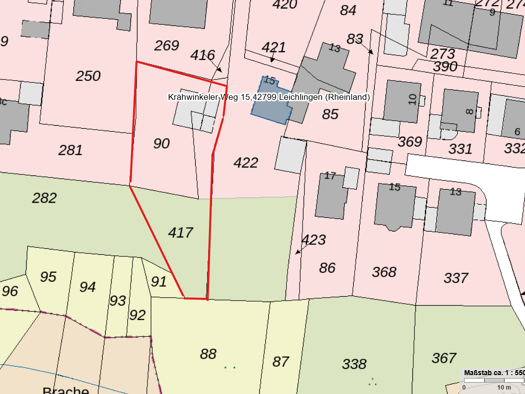 Das angebotene Grundstück ist ca. 433 m² groß und kann gem. Nachbarbebauung mit einem Einfamilienhaus im dargestellten Baufenster bebaut werden. Es liegt in einer Stichstraße unmittelbar vor einem We...