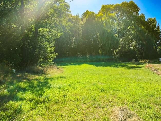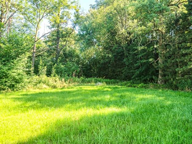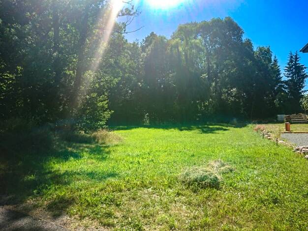 Das Grundstück liegt nahezu eben. Die östliche Hälfte ist mit einigen Nadelbäumen bewachsen. Hier steht auch ein hölzerner Schuppen. Die westliche Seite besteht überwiegend aus Wiese sowie kleineren ...