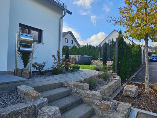 Objektbeschreibung großzügiges Einfamilienhaus, ideal für Menschen, die keinen Garten pflegen wollen. Große Garage, Einbauküche, 2 Bäder, Gäste WC und im Obergeschoss gibt es eine Masionette-Wohnung....