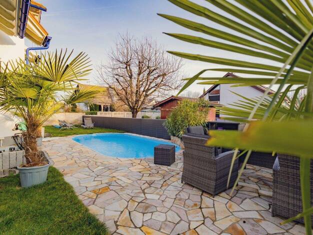 Elegantes Einfamilienhaus mit Einliegerwohnung, Design-Architektur und beheiztem Pool Dieses außergewöhnliche Einfamilienhaus aus dem Baujahr 1982 präsentiert sich heute dank kontinuierlicher Moderni...