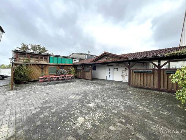 Große Gewerbeeinheit mit bisheriger Nutzung als Gastronomiebetrieb inkl. Biergarten, Stellplätzen und weiterer Gewerbeeinheit mit individueller Nutzung. Zusätzlich drei separate Wohneinheiten für pri...